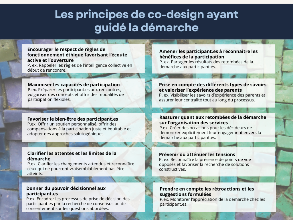 Basées sur une recension des écrits1, l’équipe a identifié des pratiques à mettre en place afin d’assurer une participation pleine et entière et une véritable prise en compte des savoirs expérientiels d’usager·ères aux profils sociaux diversifiés. Ces pratiques ont ensuite été traduites en principes afin de guider la planification des travaux de co-design. Vous trouverez ci-dessous une infographie synthétisant les différents principes clés ayant guidé la démarche de co-design.